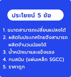 ประโยชน์ 5 ข้อ![]() 1. サイズの変更可能 2. タイ生産なので少量でも対応可能 3. 軽量、高強度 4. さびに強い(溶融亜鉛メッキ鋼板使用) 5. 低価格 |