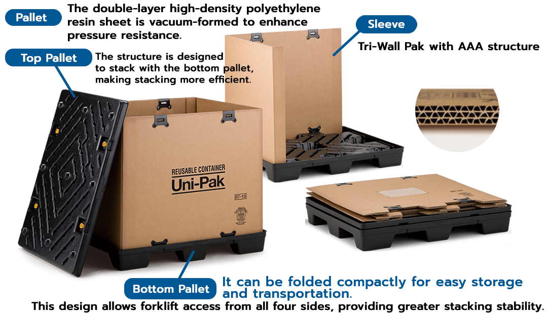 Unipack, as a returnable container logistics system, enables significant cost reductions across all stages of logistics, including packing, handling, transportation, and storage. Rental and custom-made options are also available. |