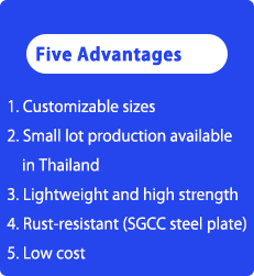 Five advantages![]() 1. Adjustable size 2. Produced in Thailand, so even small quantities can be accommodated 3. Lightweight, high strength 4. Rust-resistant (made with hot-dip galvanized steel) 5. Low cost |