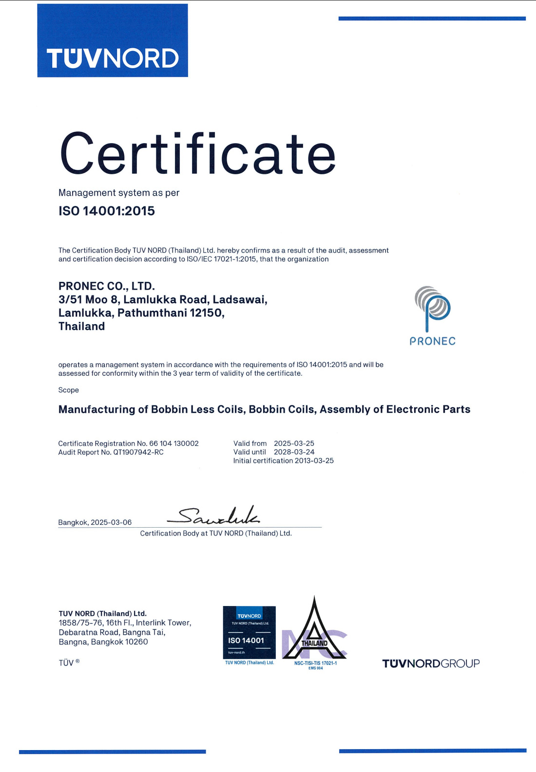 【Certification】PRONEC has been certified by ISO-9001 and ISO-14001.