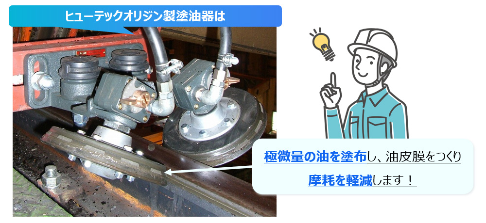 車輪やレールの摩擦面へ微量の油を塗り、潤滑被膜を形成することができるニッチ製品。