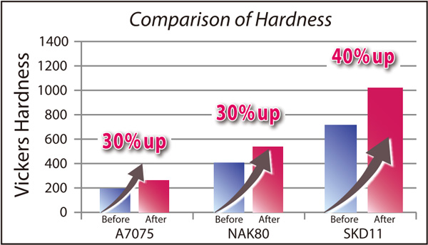Important portion of mold dies such as pinch-off structure or sharp edges on the parting line can be processed. Hardness, fatigue strength and slideability can be improved without making edges dull. |