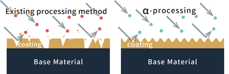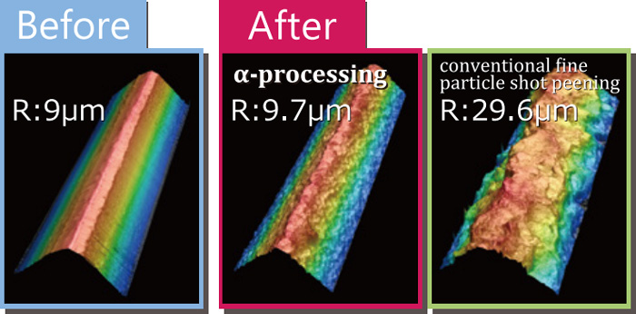 A unique air blasting technology "α-processing" creates "Nano crystal" that is much finer than the crystal created by conventional fine particle shot peening. Hardness is improved by Nano-crystalizing the top most layer of the parts. And, "peening effect" applies residual compressive stress as well. And, "fine texture" formed by α-processing reduces the contact area so that sliding resistance is also reduced to improve slideability.